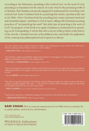 Kevin J. Vanhoozer: "Sam Chan uses fresh tools--speech act philosophy--to bolster the Reformers' intuition that preaching (unlike theology) is not simply talk about God, but God's own personal address to the gathered assembly of the faithful today."